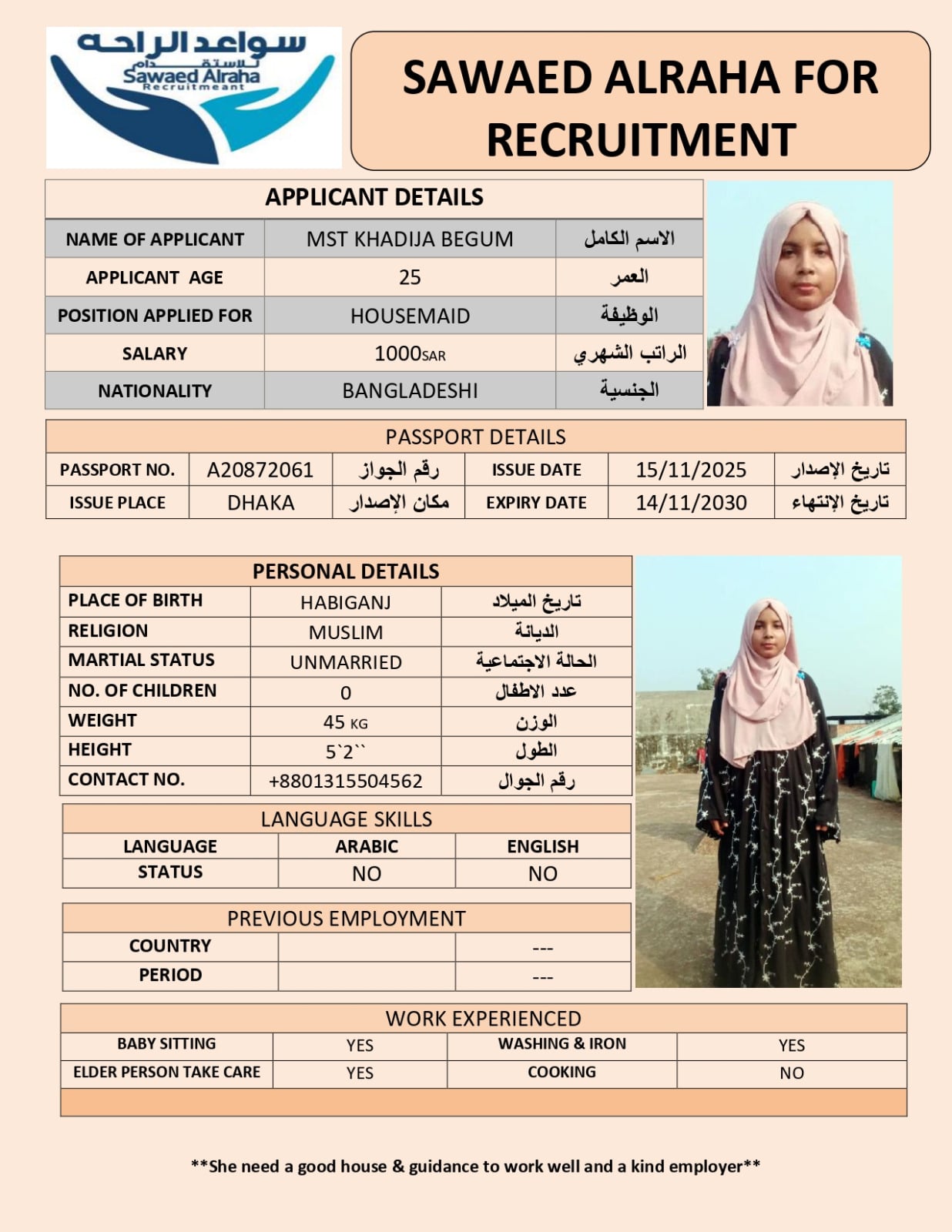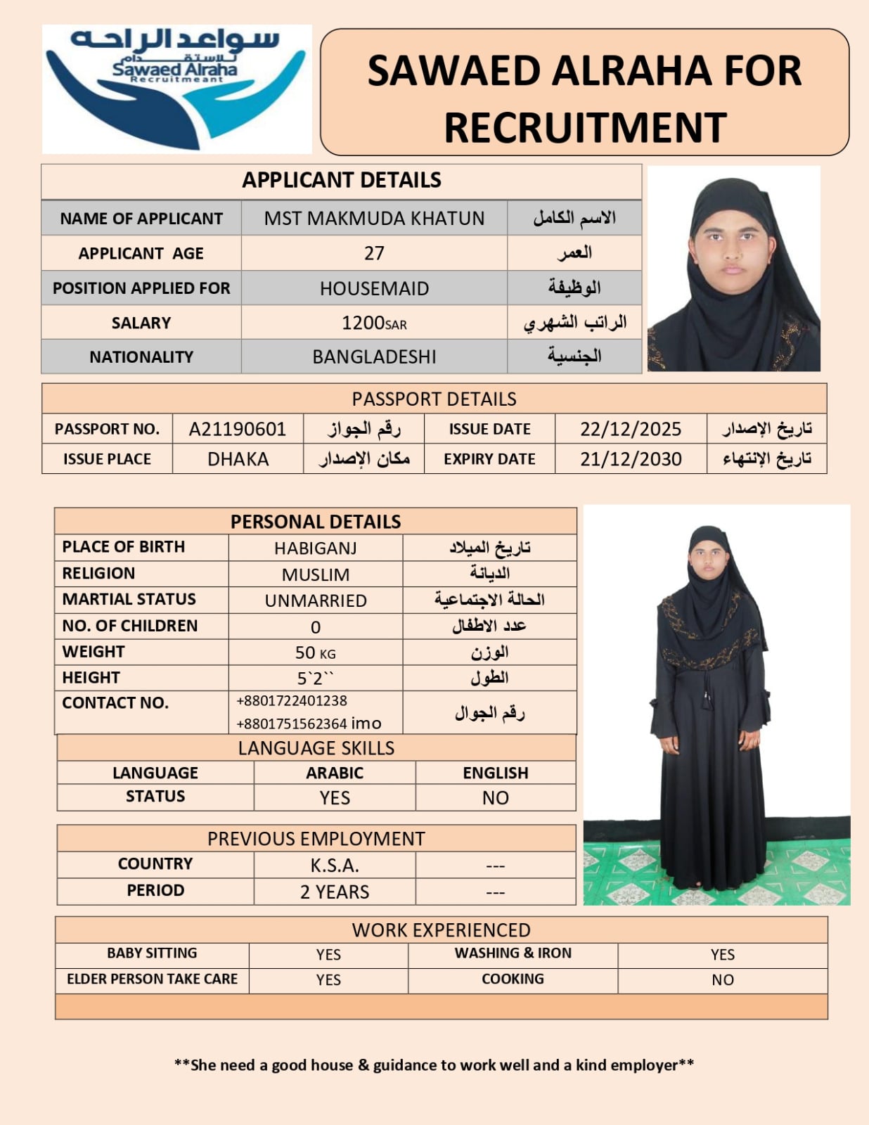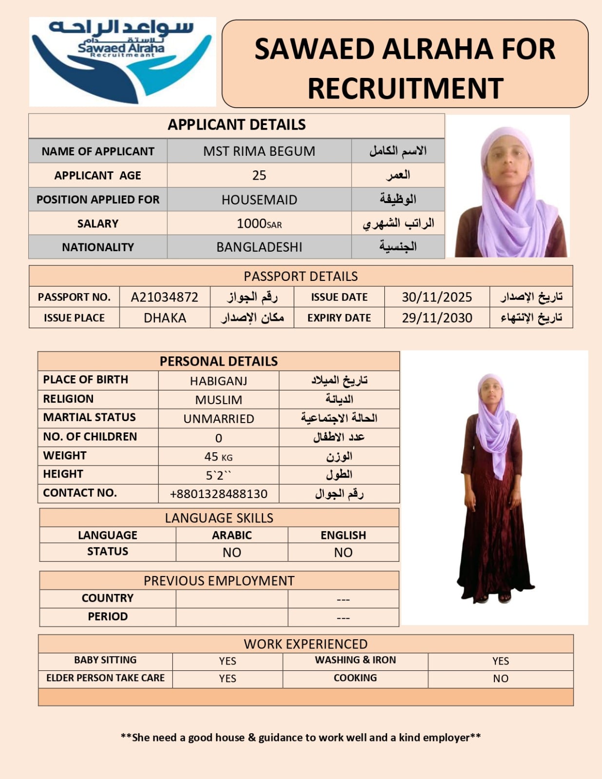 MST RIMA BEGUMSulthan2014121 فبراير، 2026MST RIMA BEGUM الديانة مسلم الخبرة العملية الجنسيةبنجلادش العمر25 اطلب الخدمة الان اطلب الخدمة الان ... اقرأ أكثر