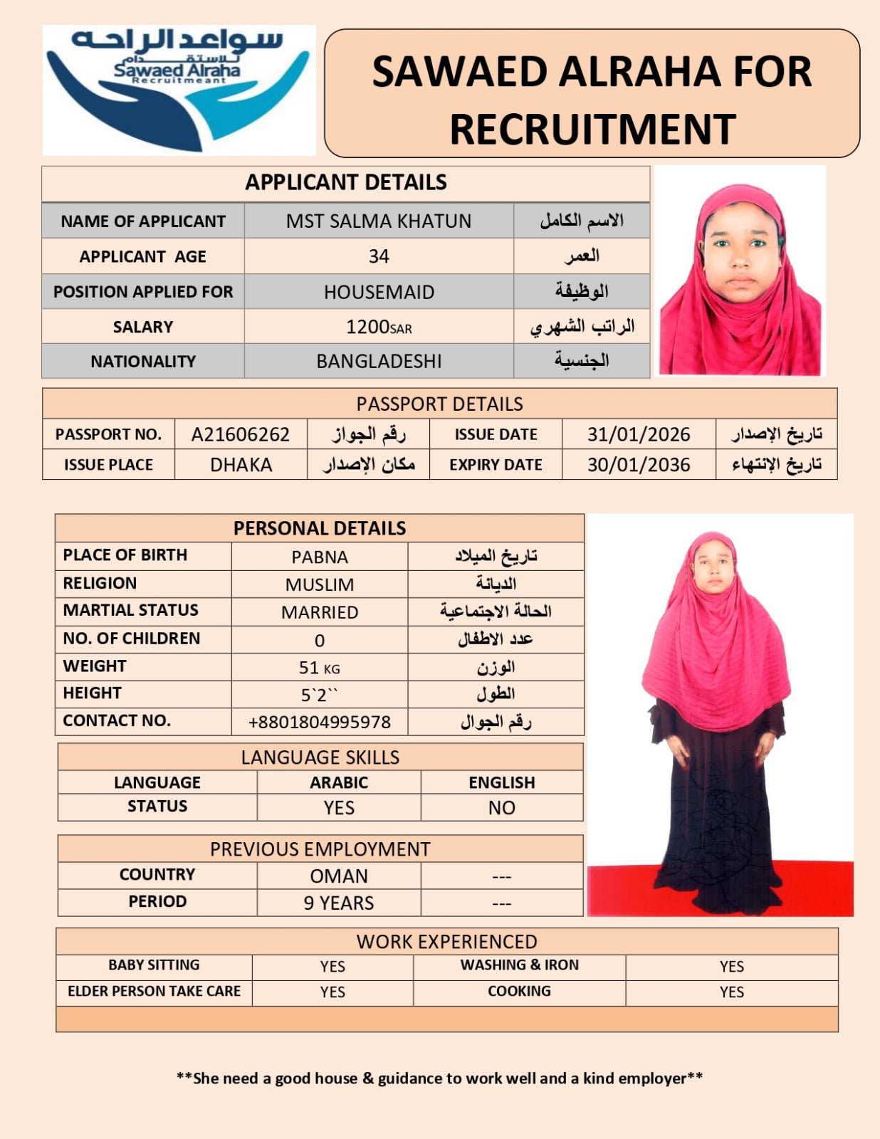 MST SALMA KHATUNSulthan2014121 فبراير، 2026MST SALMA KHATUN الديانة مسلم الخبرة العمليةلديه خبرة سابقة الجنسيةبنجلادش العمر34 اطلب الخدمة الان اطلب الخدمة الان ... اقرأ أكثر