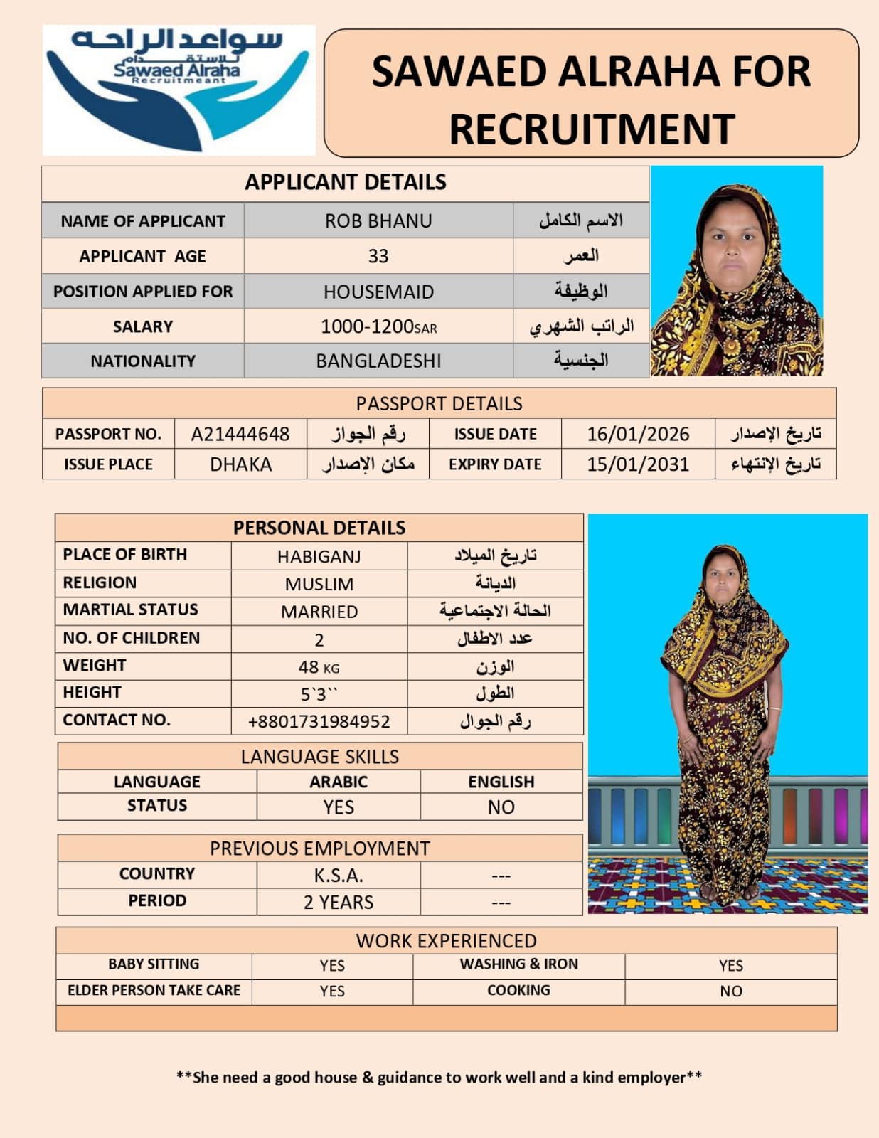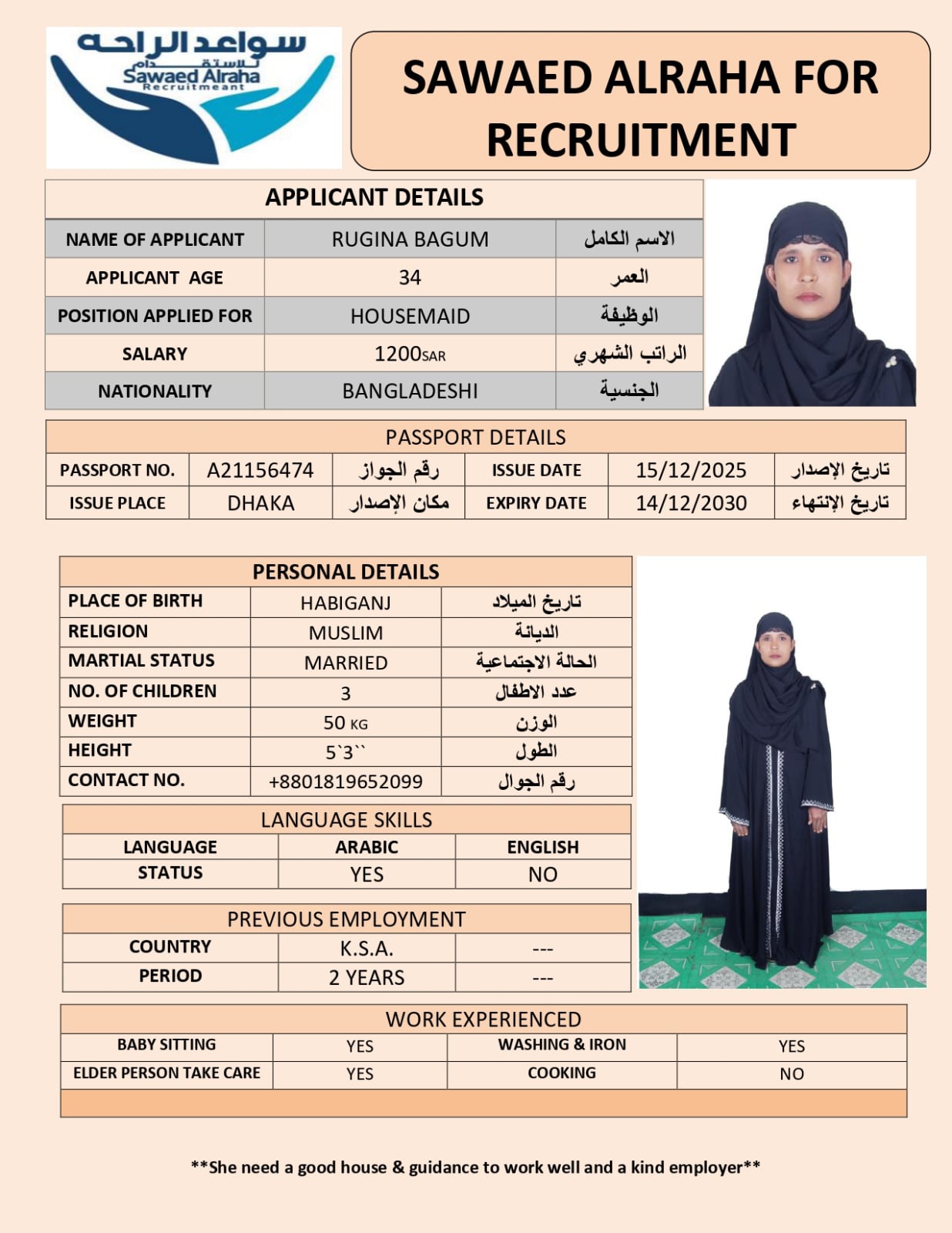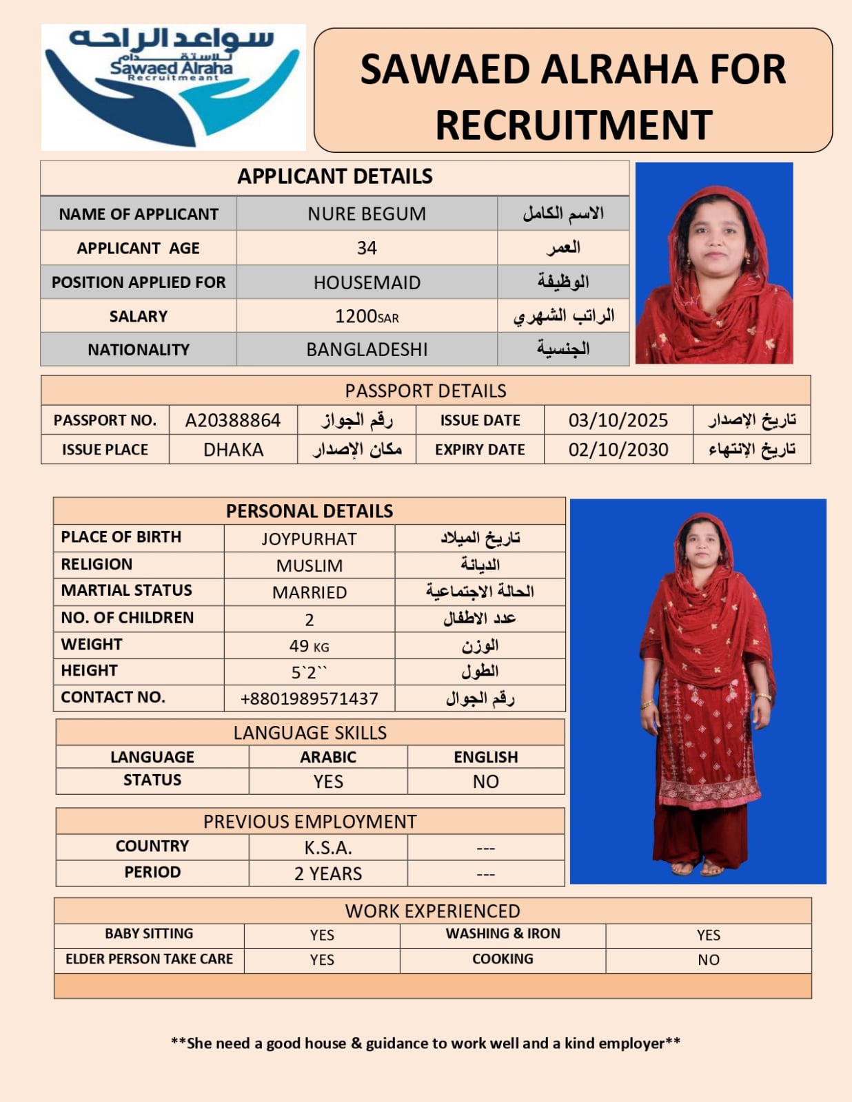 NURE BEGUMSulthan2014121 فبراير، 2026NURE BEGUM الديانة مسلم الخبرة العمليةلديه خبرة سابقة الجنسيةبنجلادش العمر34 اطلب الخدمة الان اطلب الخدمة الان ... اقرأ أكثر