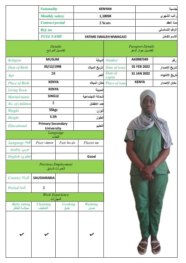 FATIME SWALEH MWAGAOSulthan201413 فبراير، 2026FATIME SWALEH MWAGAO الديانة مسلم الخبرة العمليةلديه خبرة سابقة الجنسيةكينيا العمر28 اطلب الخدمة الان اطلب الخدمة الان ... اقرأ أكثر