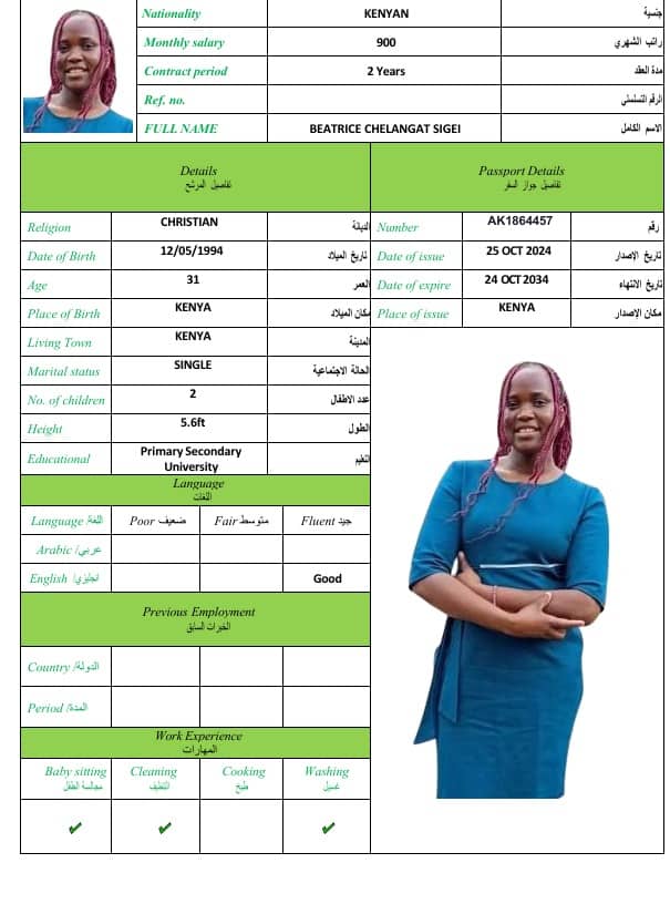 BEATRICE CHELANGAT SIGEISulthan2014111 فبراير، 2026BEATRICE CHELANGAT SIGEI الديانةغير مسلم الخبرة العملية الجنسيةكينيا العمر31 اطلب الخدمة الان اطلب الخدمة الان ... اقرأ أكثر