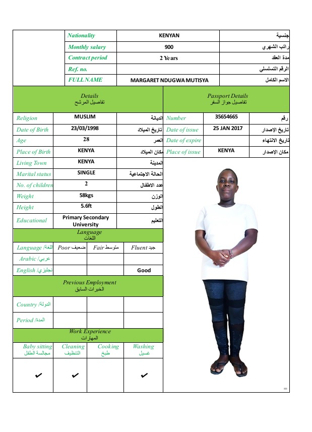 MARGARET NDUGWA MUTISYASulthan2014123 فبراير، 2026MARGARET NDUGWA MUTISYA الديانة مسلم الخبرة العملية الجنسيةكينيا العمر28 اطلب الخدمة الان اطلب الخدمة الان ... اقرأ أكثر
