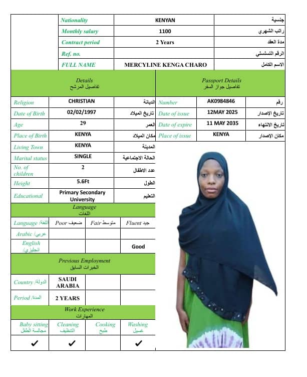 MERCYLINE KENGA CHAROSulthan2014124 فبراير، 2026MERCYLINE KENGA CHARO الديانةغير مسلم الخبرة العمليةلديه خبرة سابقة الجنسيةكينيا العمر29 اطلب الخدمة الان اطلب الخدمة الان ... اقرأ أكثر